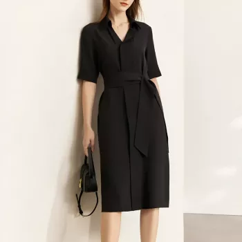 Shirt Dress with Belt Waist for Women – Casual Black Office Dress