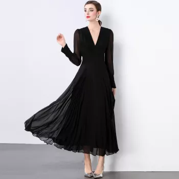 Elegant Black V-Neck Silk Dress with Waist Fold – Knee-Length Long Sleeve