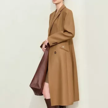 Minimalist Wool Long Coat with Lapel Collar and Metal Detail for Women