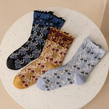Retro Floral Ruffle Socks for Women – Harajuku Kawaii Mid-Calf Cotton Blend